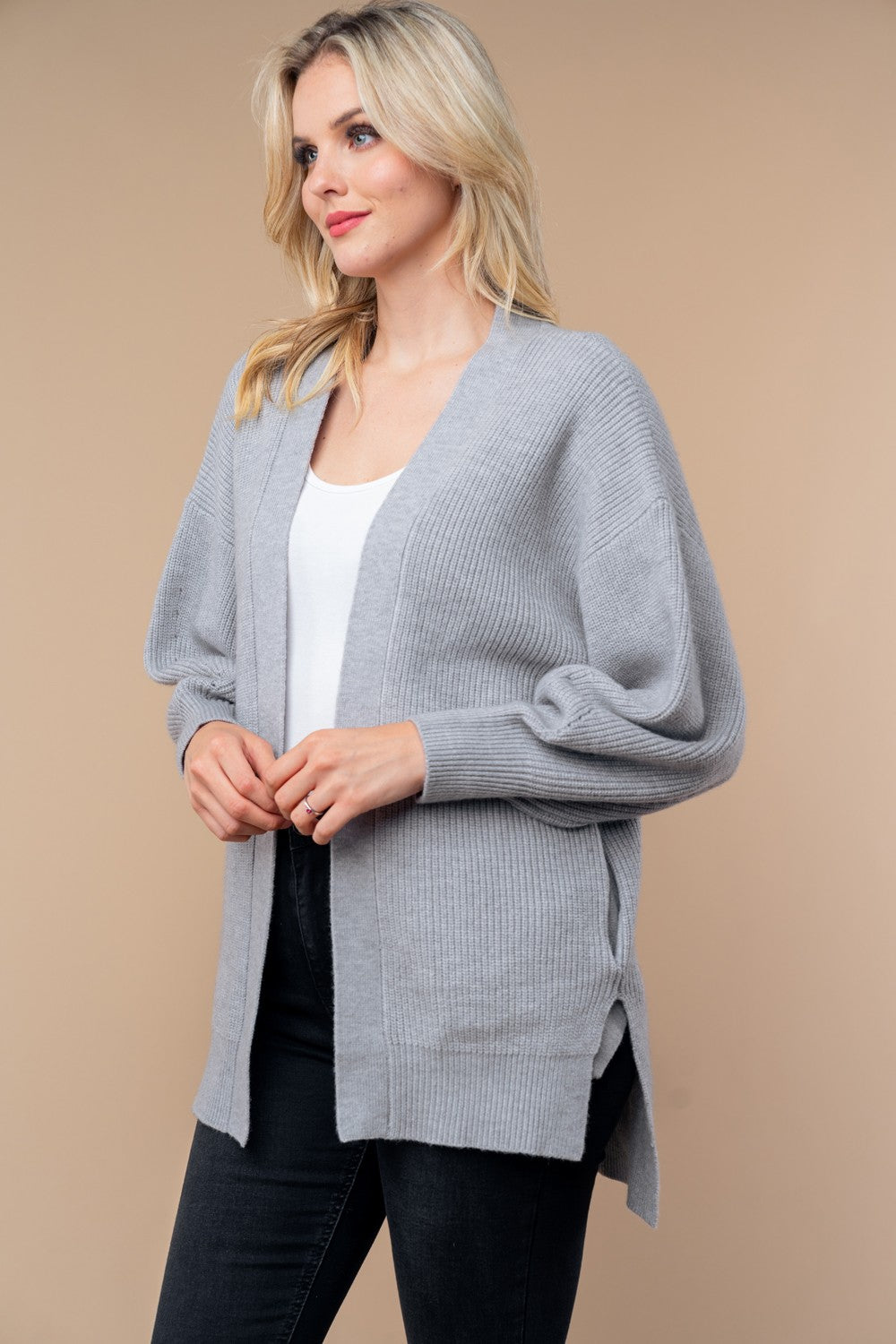 A long sleeve solid knit cardigan with an open front featuring side slits and a true-to-size fit. Fabric is a lightweight knit. Model is 5'10" and is wearing a size Small.