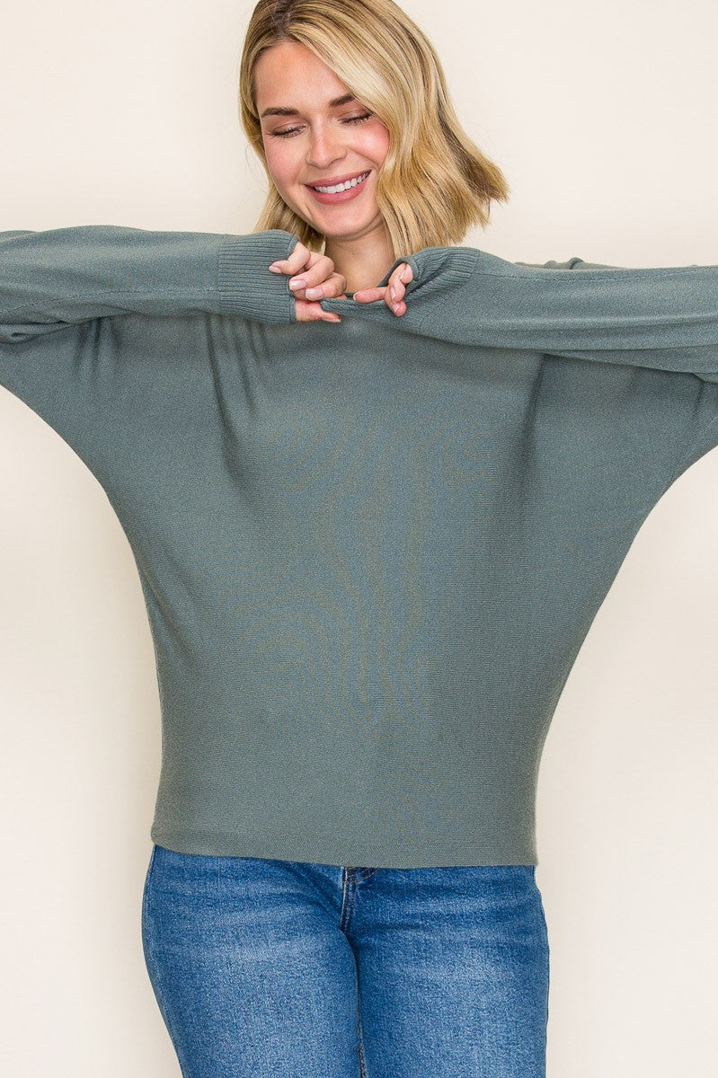 WIDE CREW NECK, LONG DOLMAN SLEEVE, SOLID PULLOVER SWEATER