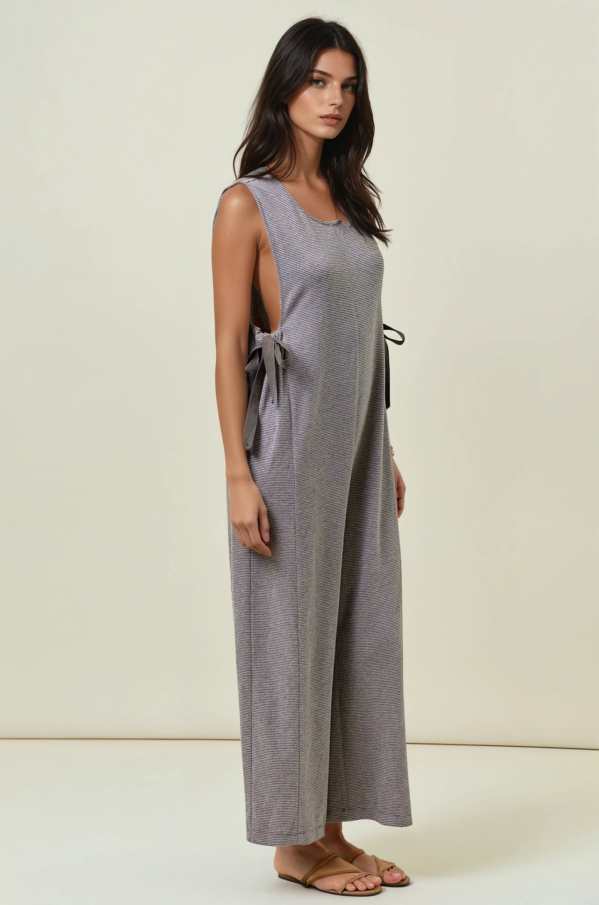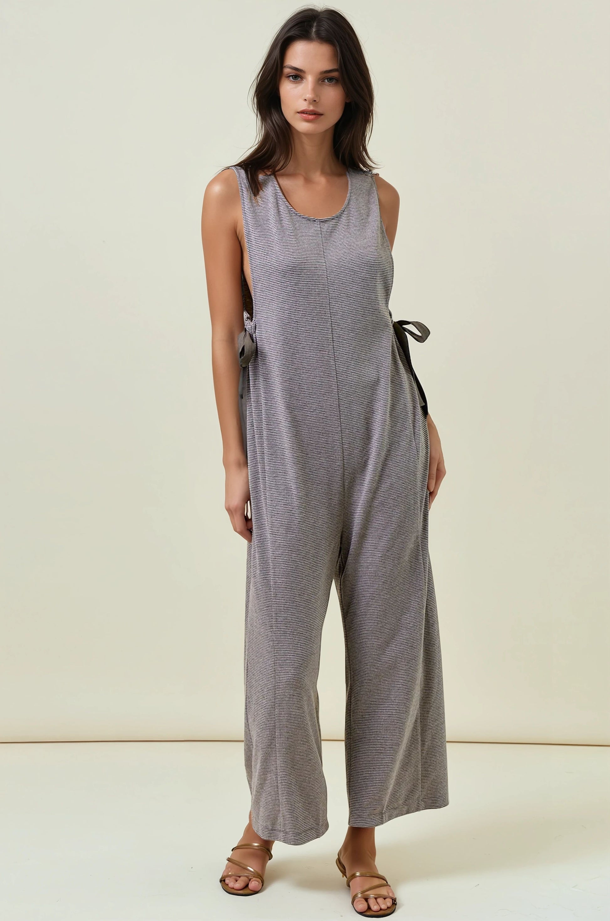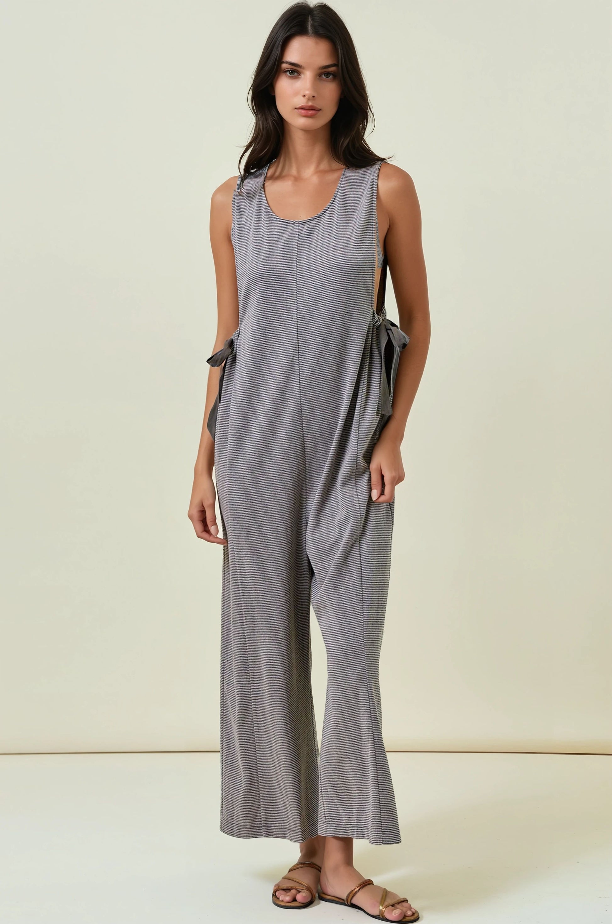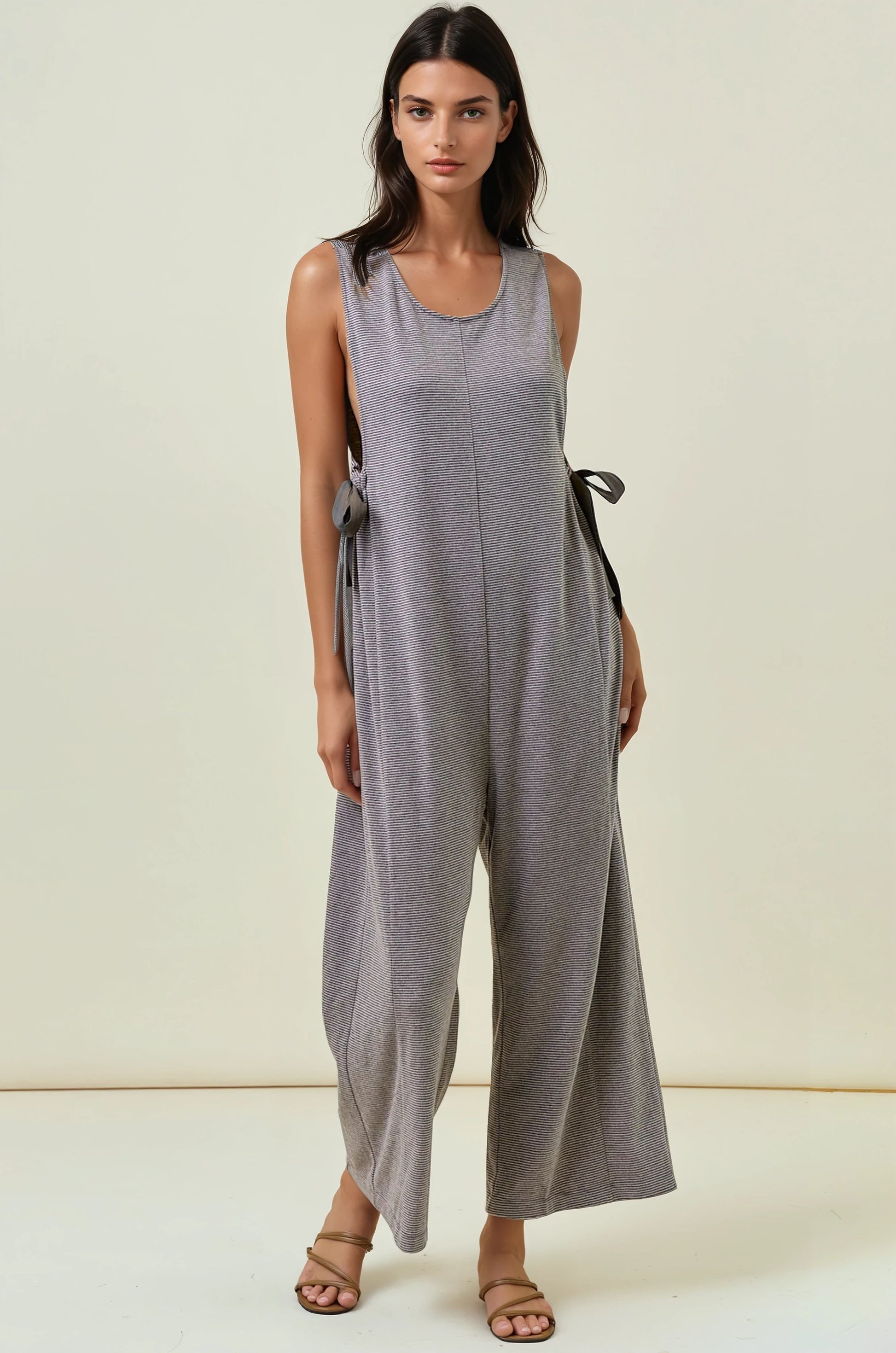 BUTTERY SOFT STRIPED KNIT OVERALLS W/ SIDE RIBBON TIE - Ultra-soft, lightweight knit fabric for all-day comfort - Subtle striped pattern adds a touch of texture and visual interest - Chic side ribbon ties at the waist for adjustable fit and feminine detail - Relaxed, wide-leg silhouette for a modern, effortless look STYLE MEASUREMENTS (SIZE SMALL) - TOTAL LENGTH 54 1/2" - SHOULDER 13" - BUST 13" - WAIST 21" - HIP 21 1/2" - FRONT RISE 31 1/2" 78%POLYESTER 17%RAYON 5%SPANDEX MODEL IS 5'9" | BUST 34" | WAIST 25" | HIPS 37" WEARING SMALL