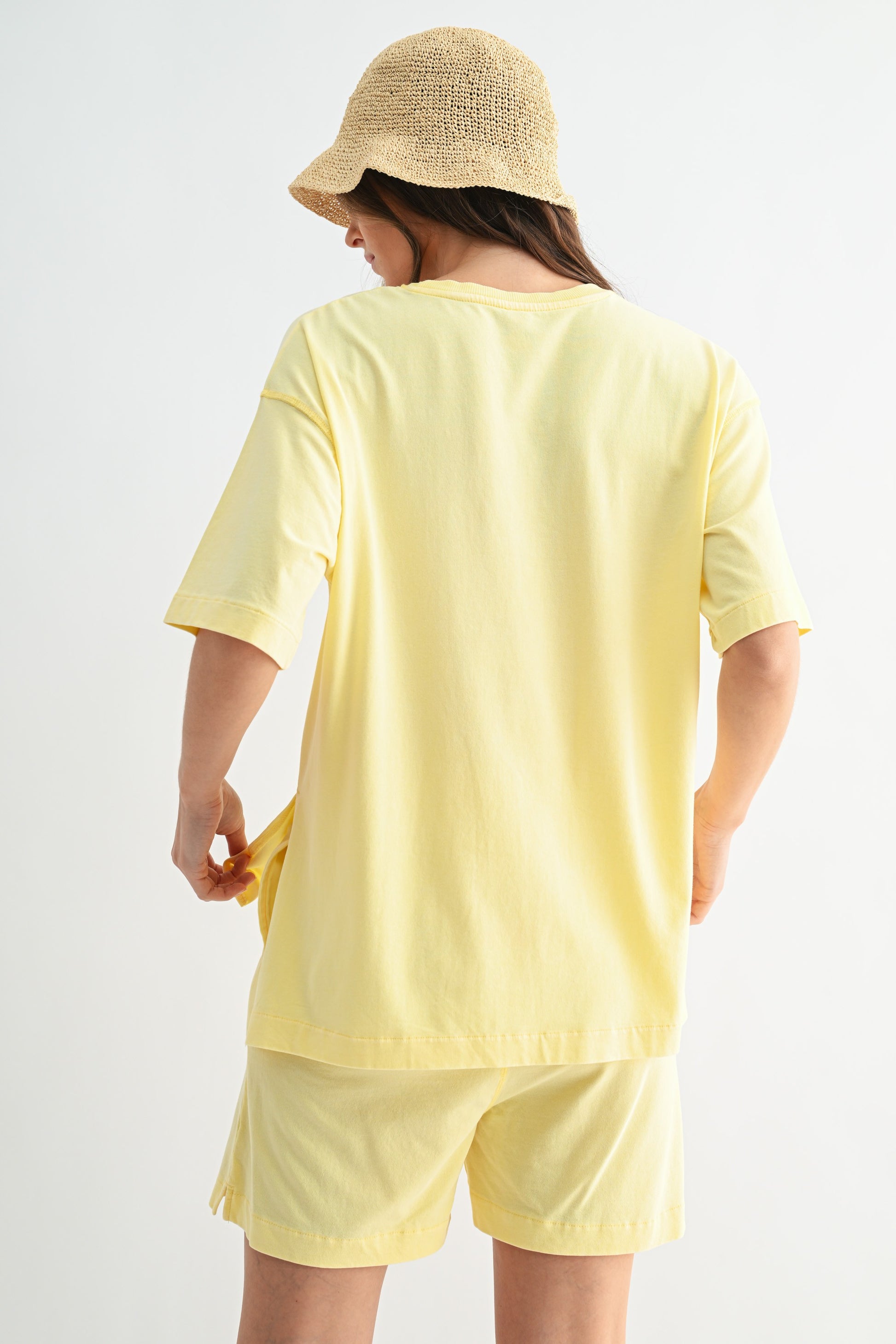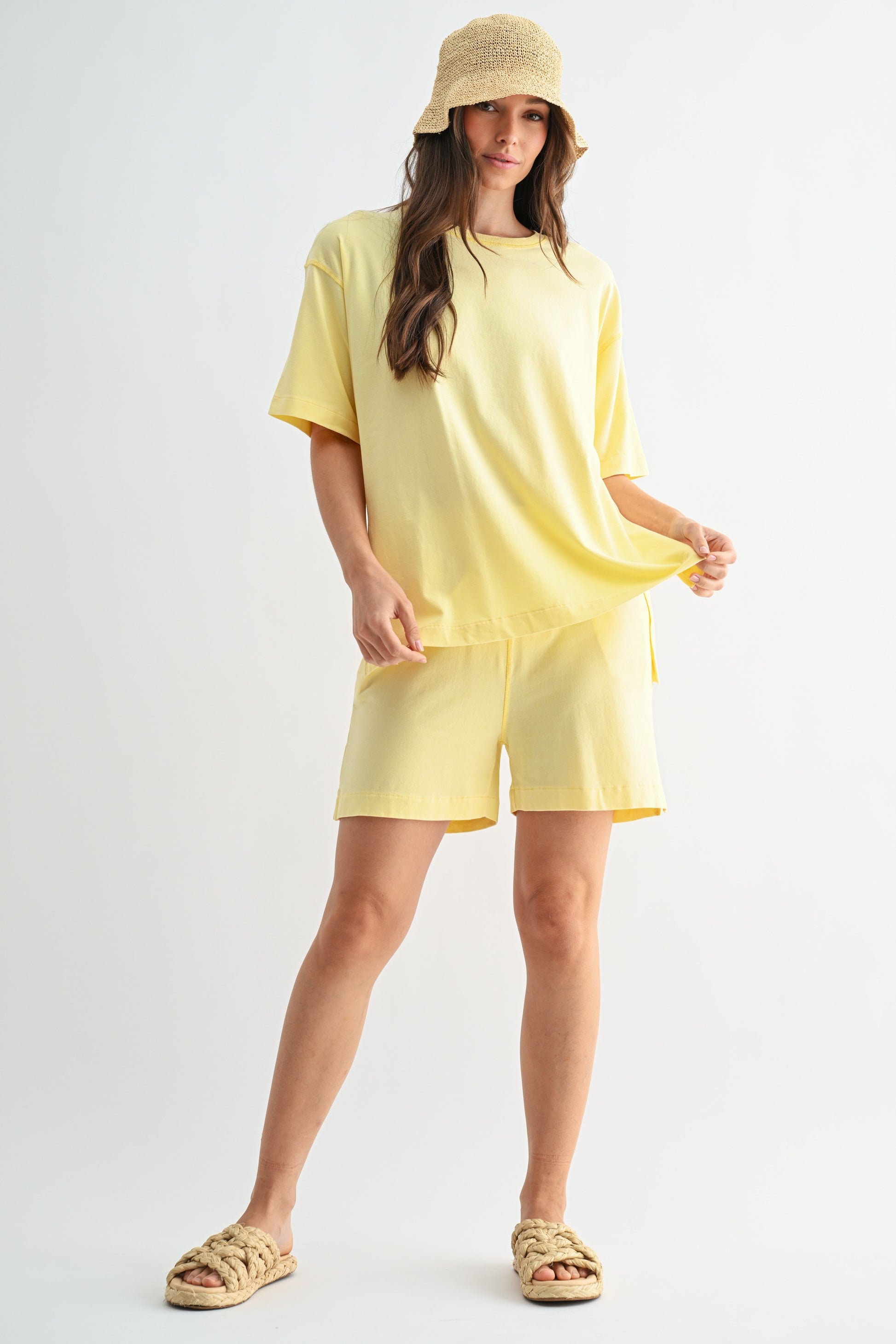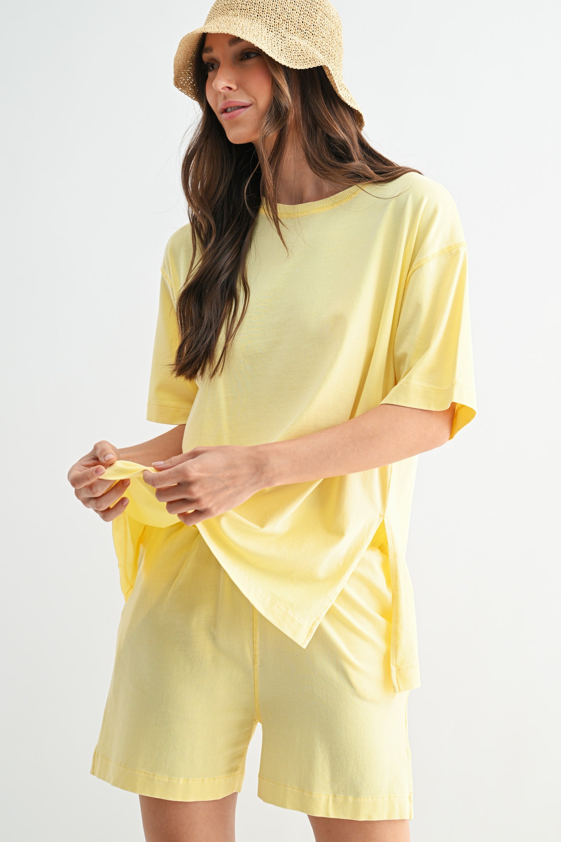 The Coastal Drift Set is your ultimate lounge and lifestyle companion, crafted from luxurious pima cotton for a soft, breathable feel. This short sleeve oversized tee features a mineral wash finish, adding a unique texture and vintage-inspired charm. Designed with a high-low hem and side slits, it offers effortless movement and a flattering silhouette. The dropped shoulders enhance the relaxed vibe, perfect for laid-back comfort. Paired with matching shorts, this set is ideal for cozy mornings, casual outings, or lounging in style. Relaxed fit, elevated comfort, timeless appeal. Katherine is a 5'9", a size 2, and is wearing an S. 95% pima cotton 5% spandex