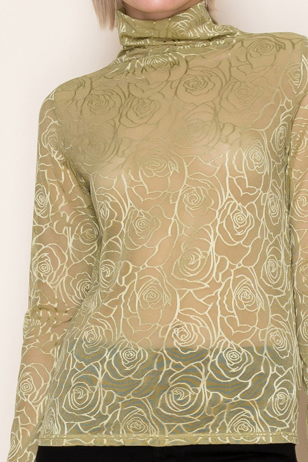 A long sleeve solid knit top with a mock neck featuring a floral mesh body
