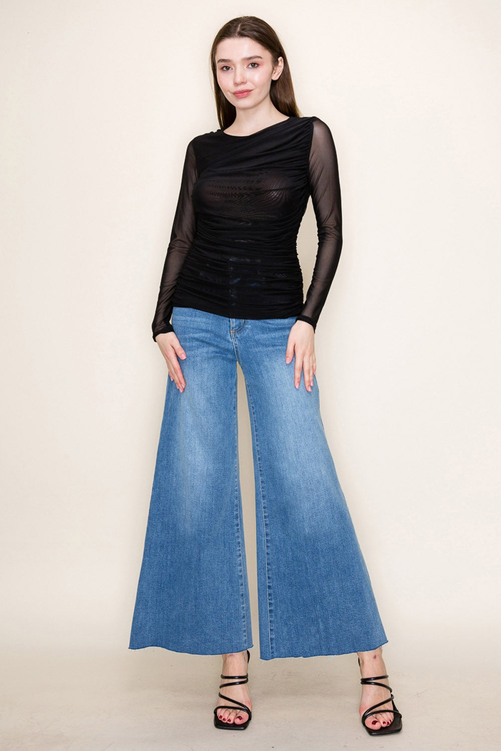 A long sleeve solid knit top with a round neck featuring a sheer fabric body