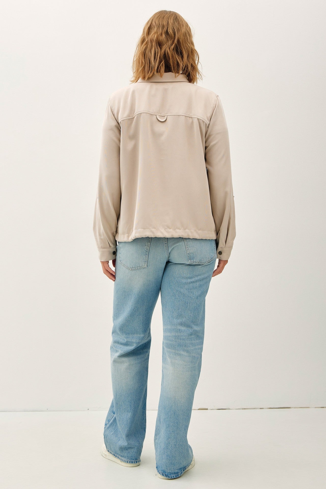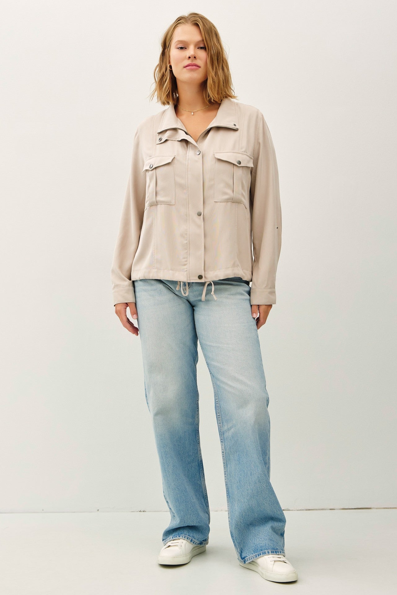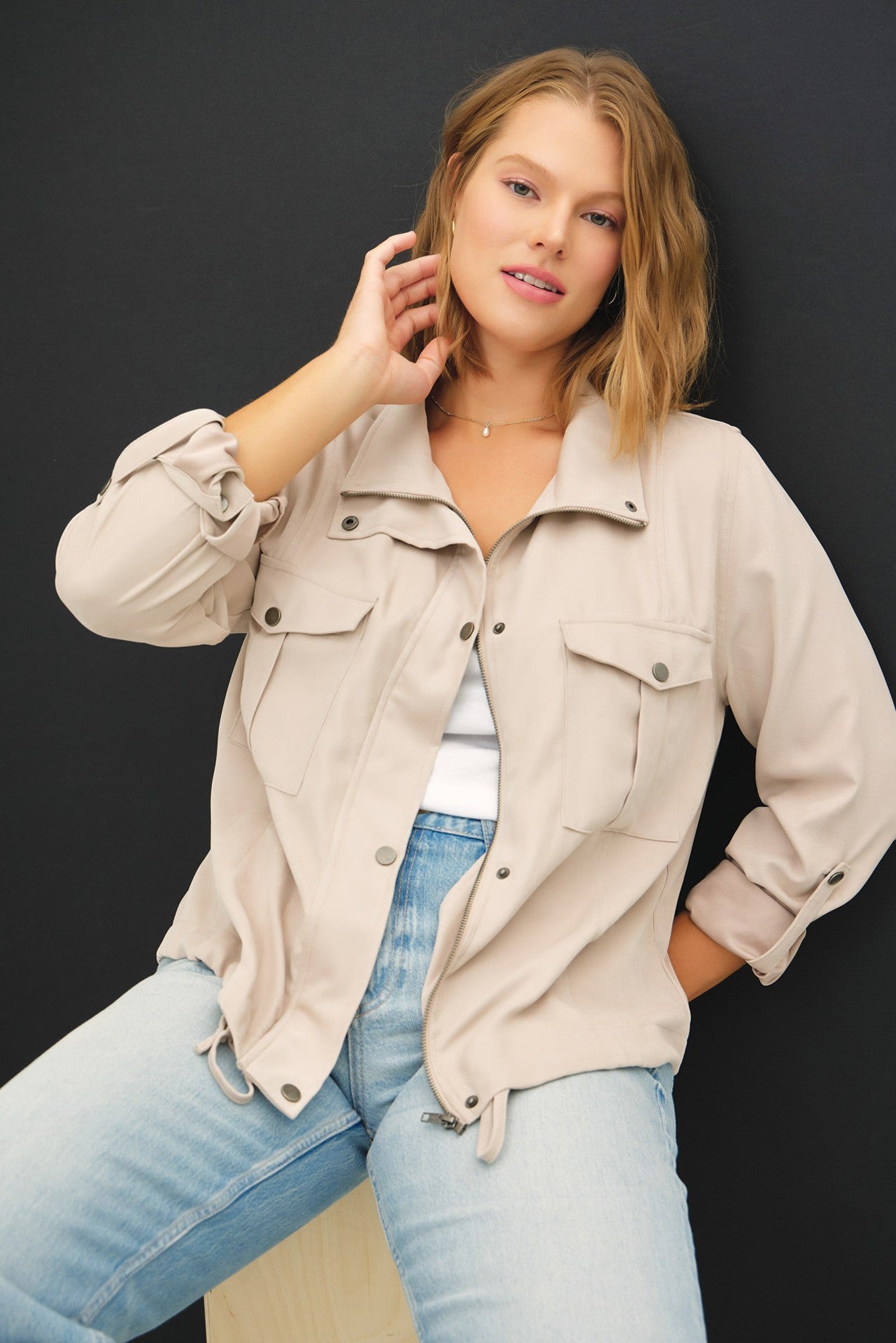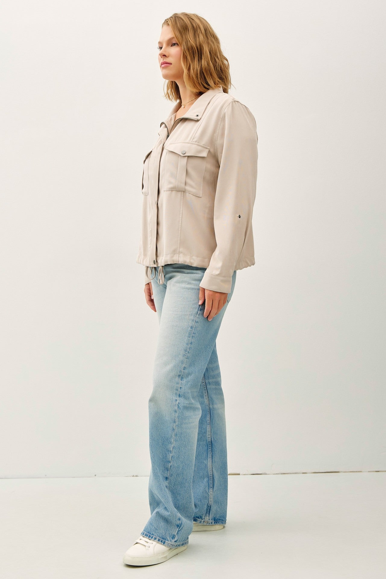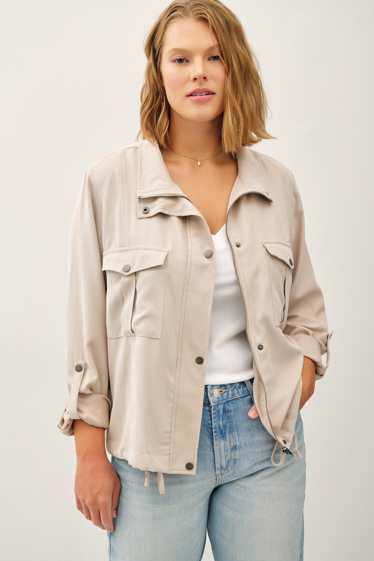* CROP UTILITY JACKET * SAFARI * OUTERWEAR * ZIPPER AND SNAP BUTTON CLOSURE * HIGH NECK * CHEST POCKETS * ROLLED CUFFS * DRAWSTRING AT HEM LINE * EXTREMELY SOFT