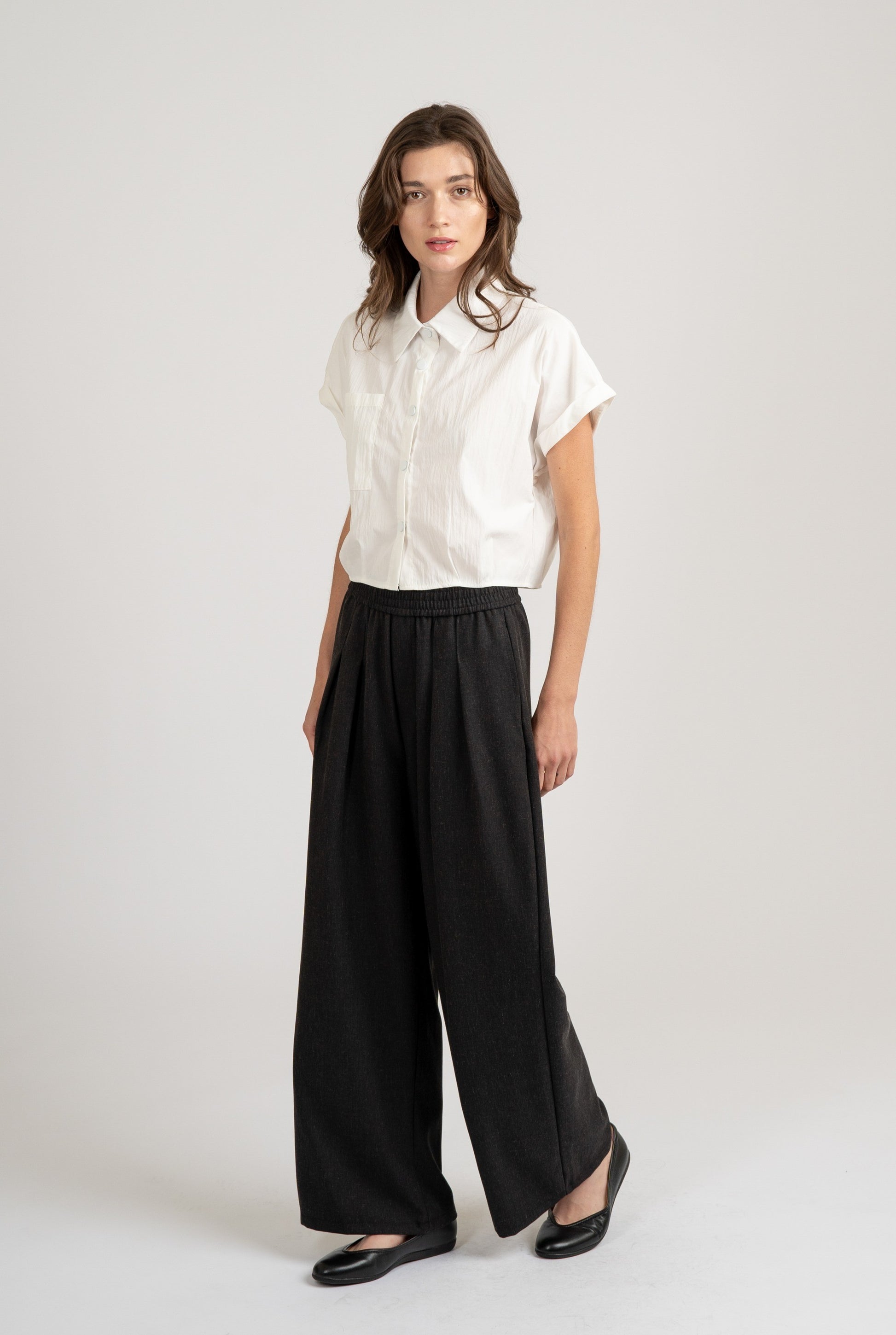 - Soft waist elastic - Front pleated detail - Side hidden pockets - Wide-leg fit - Ankle length