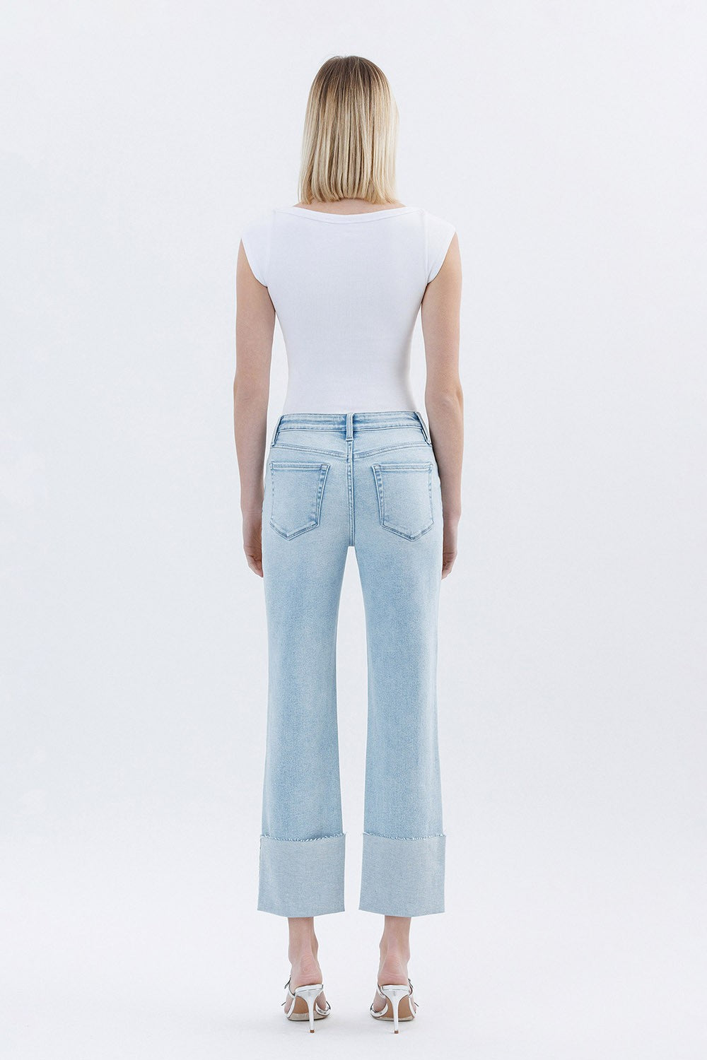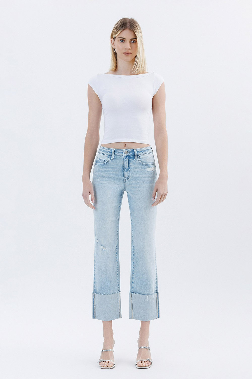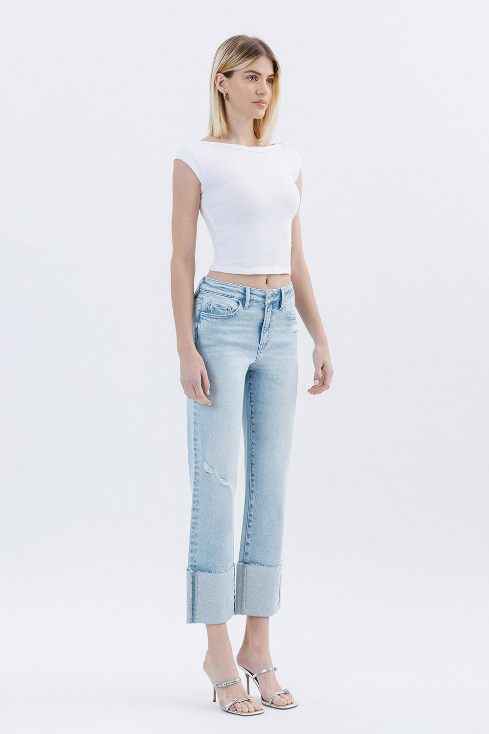 HIGH RISE CUFFED CROP STRAIGHT JEANS COMFORT STRETCH DENIM, HIGH RISE WAIST, DISTRESSED DETAIL,