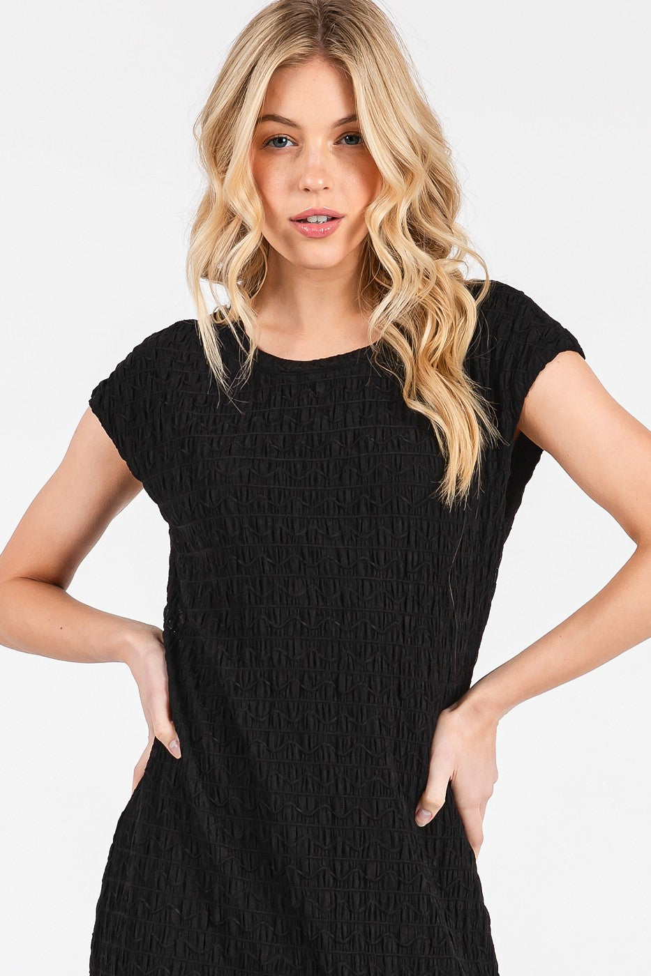 - WAVY TEXTURED STRETCHY KNIT FABRIC - ROUND NECK - SHORT CAP SLEEVE - LINED - MIDI DRESS MODEL IS 5'8" AND WEARING SIZE SMALL SELF: 94% RAYON, 6% SPANDEX LINING: 100% POLYESTER