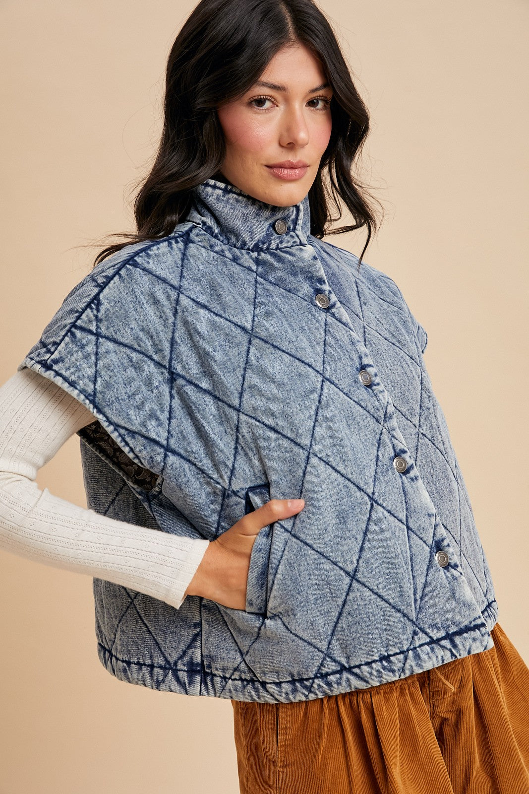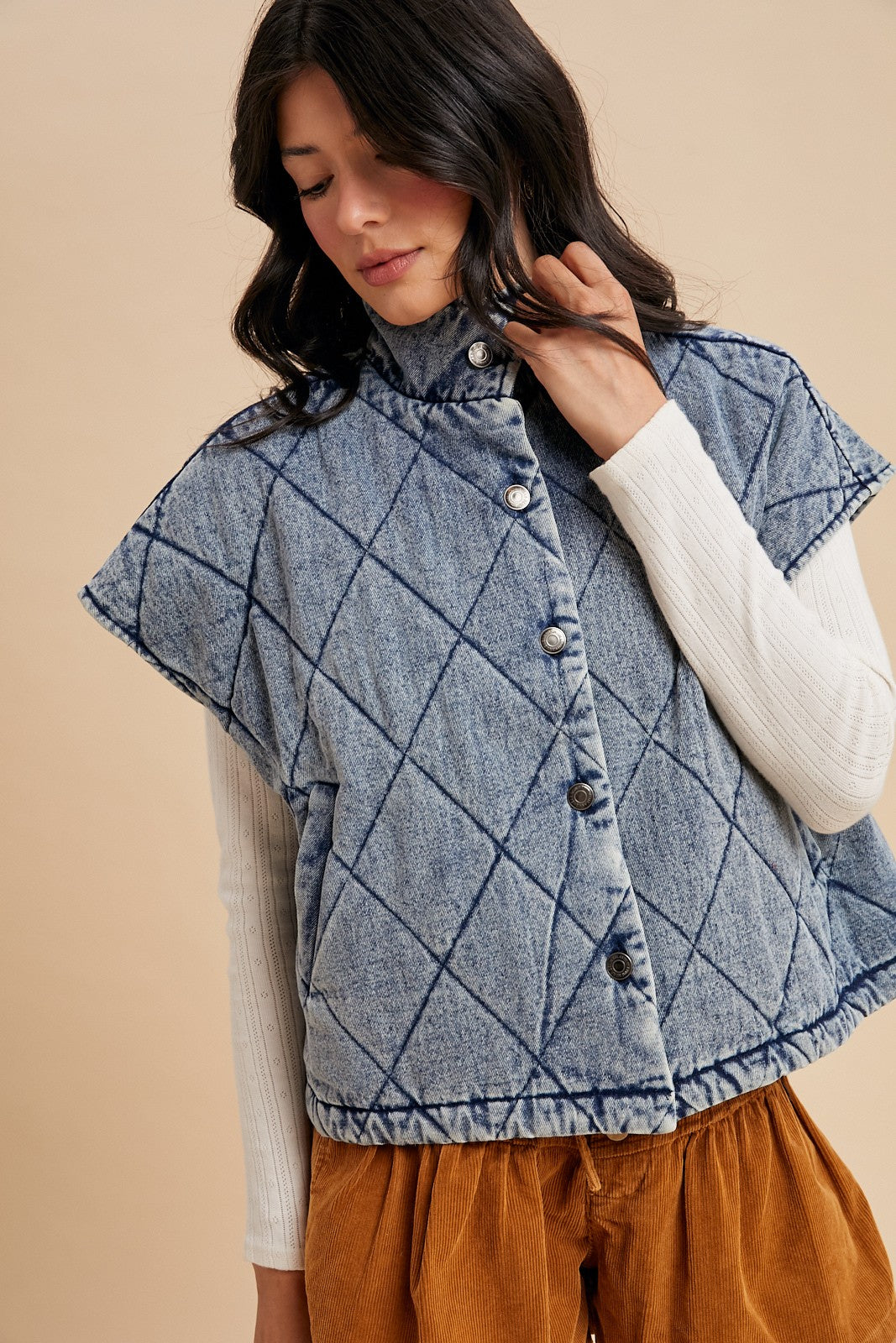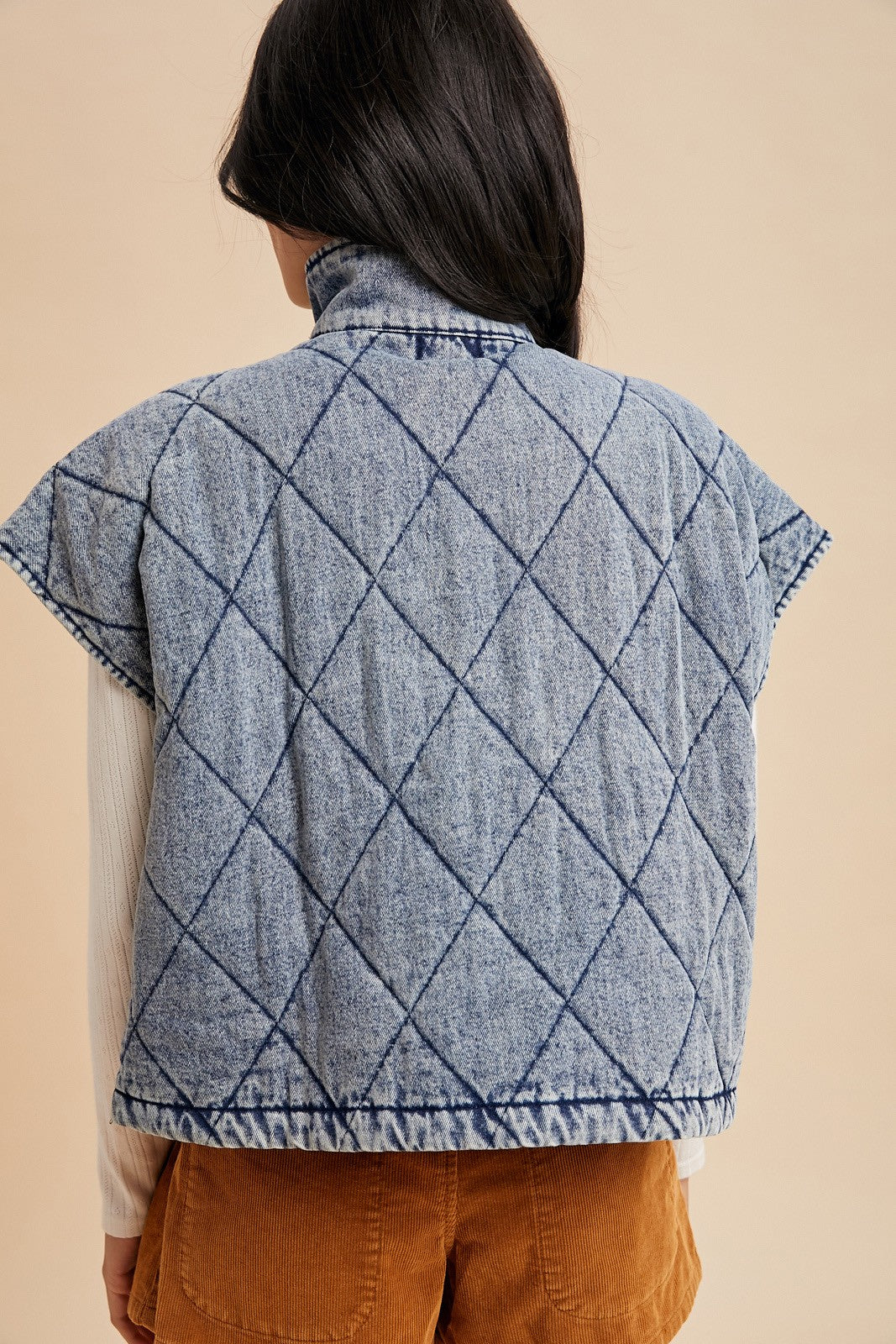 DENIM QUILTED LINER BUTTON DOWN VEST JACKET - QUILTED - VINTAGE WASHED DENIM - HIGH NECK COLLAR - BUTTON CLOSURE FRONT - OVERSIZED FIT