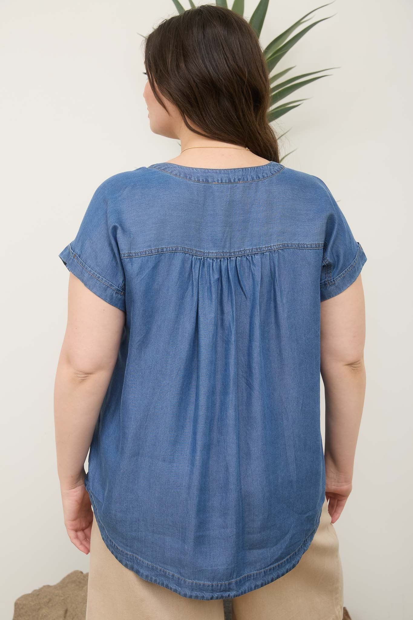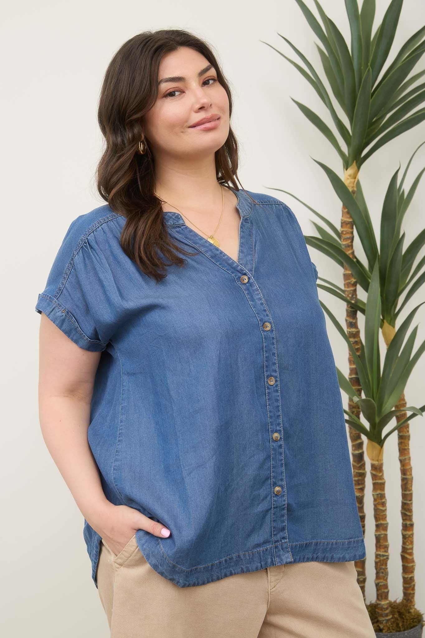 V NECKLINE SHORT SLEEVES CUFF SLEEVES BUTTON DOWN DARK DENIM PATTERN NOT LINED WOVEN TOP 100% LYOCELL