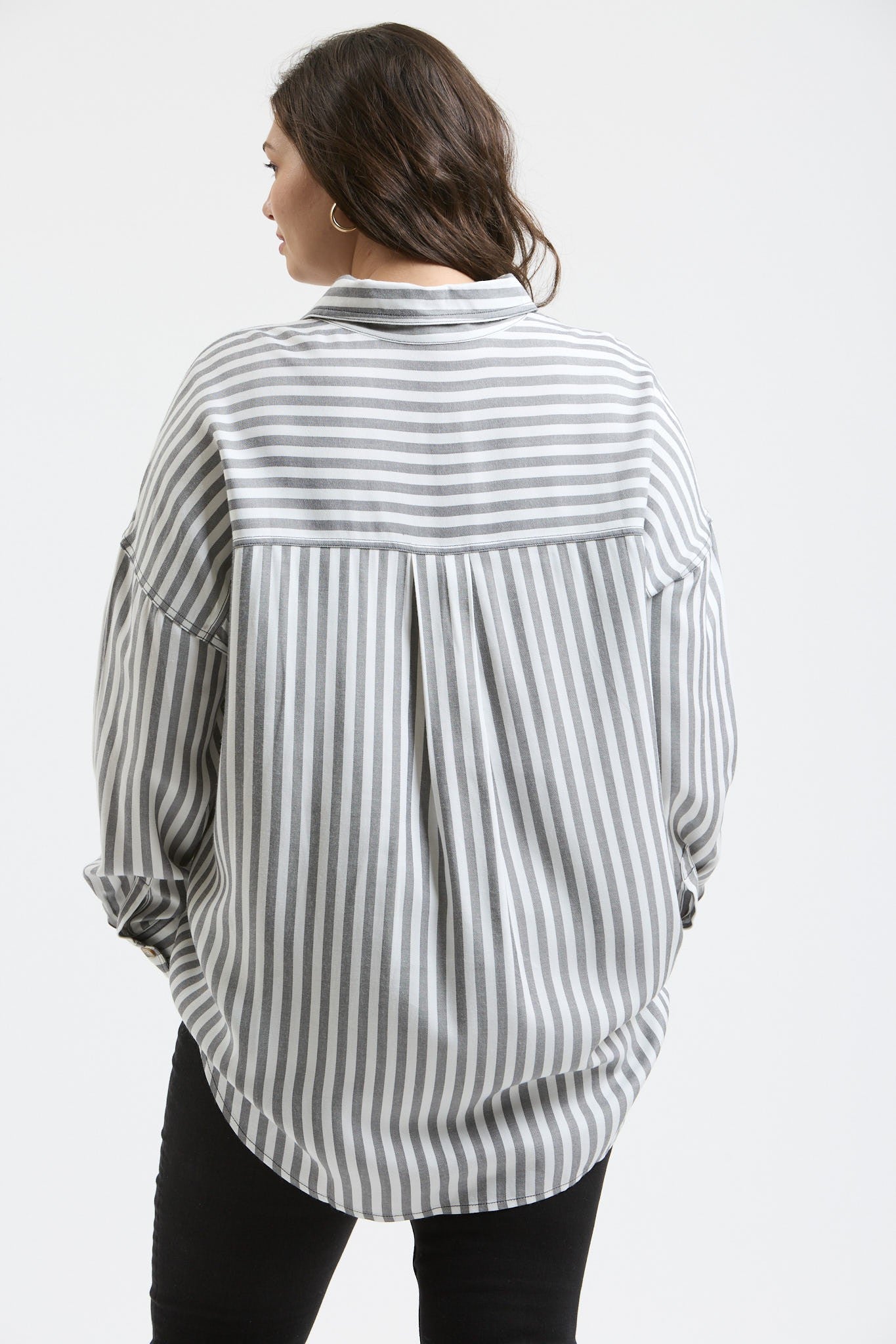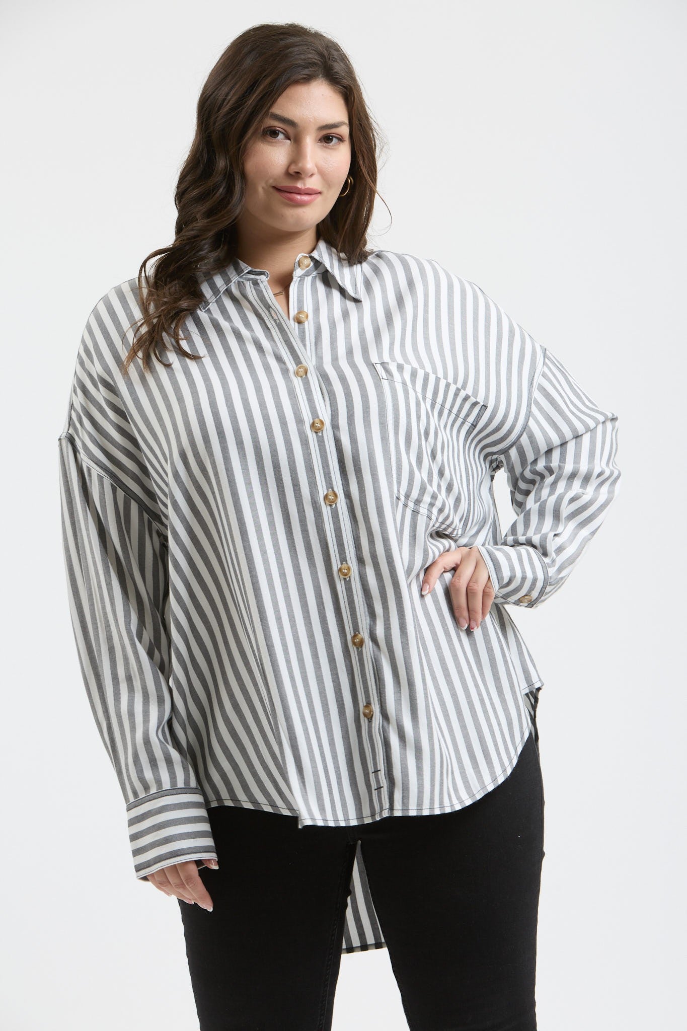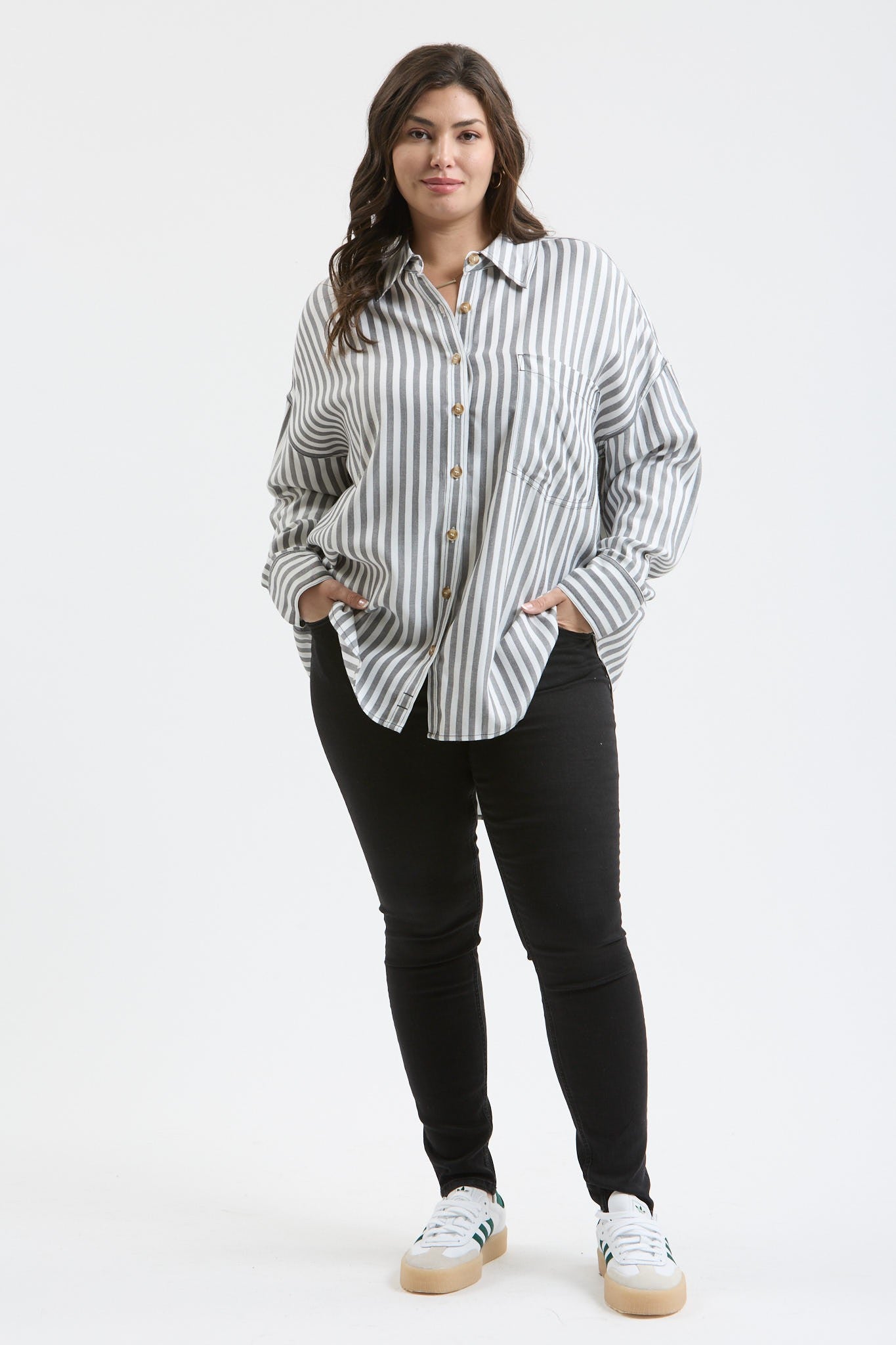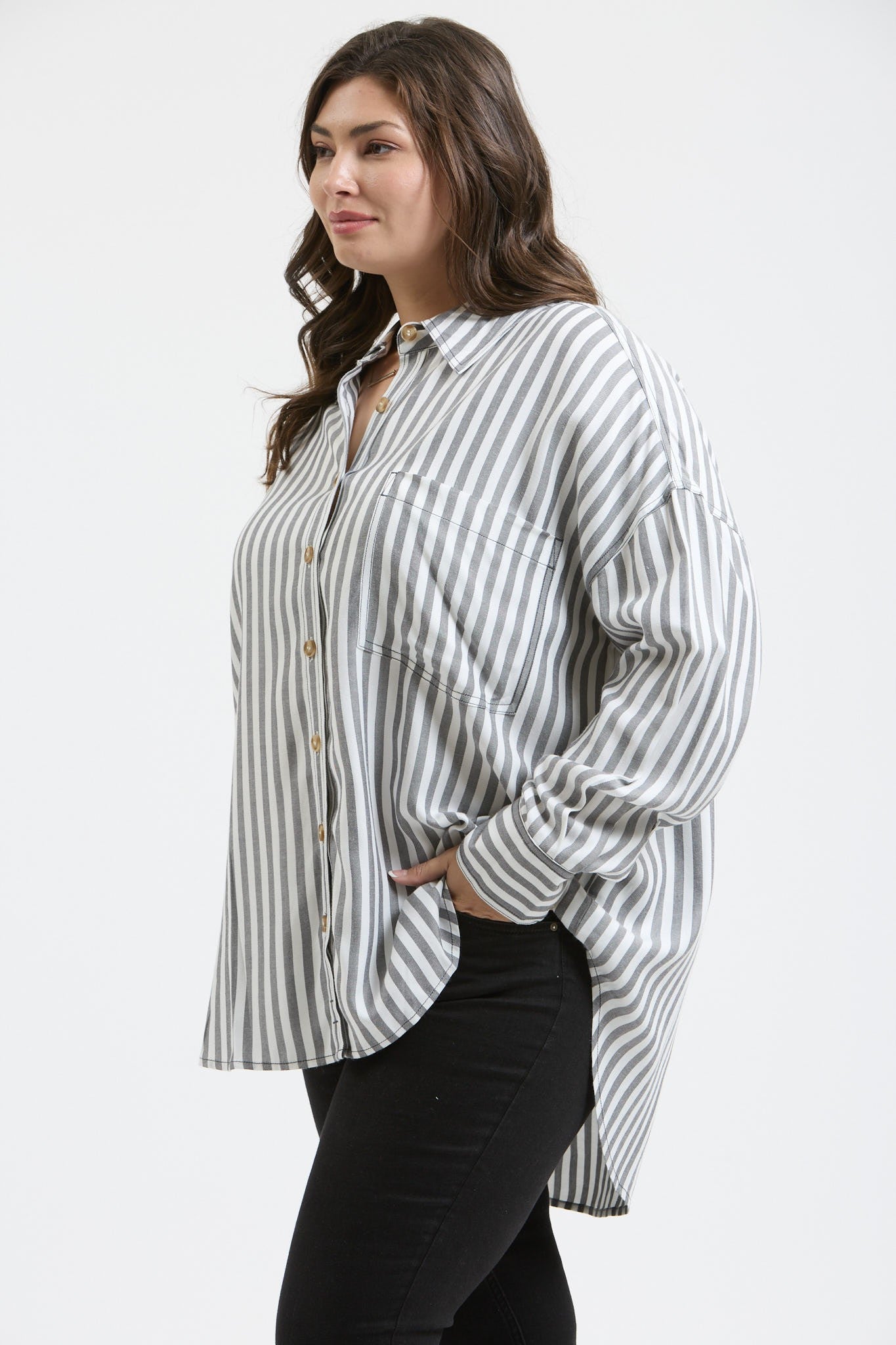 COLLARED LONG SLEEVES BUTTON DOWN POCKET BUTTON CUFF DETAIL VERTICAL STRIPE PATTERN WOVEN TOP 100% RAYON