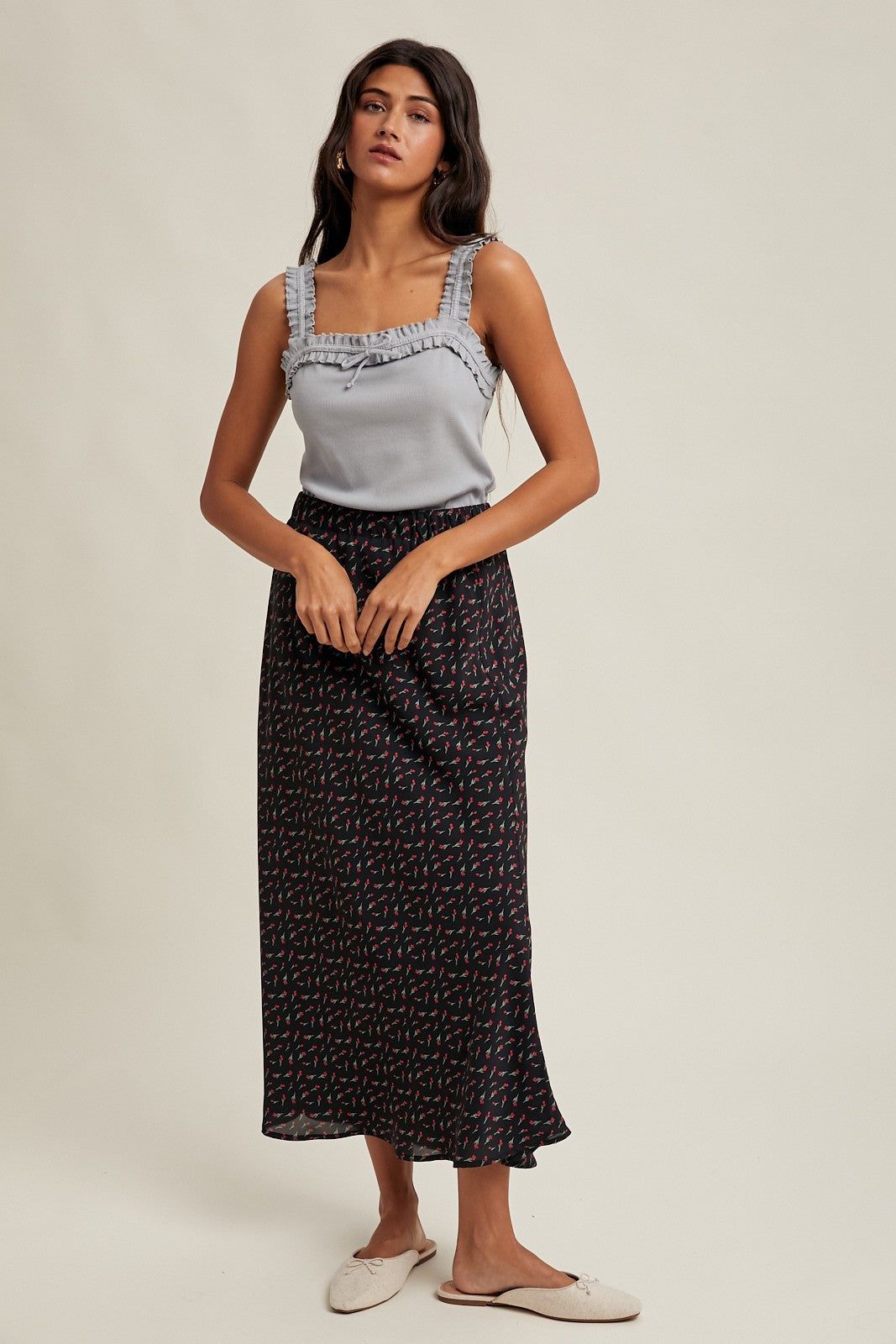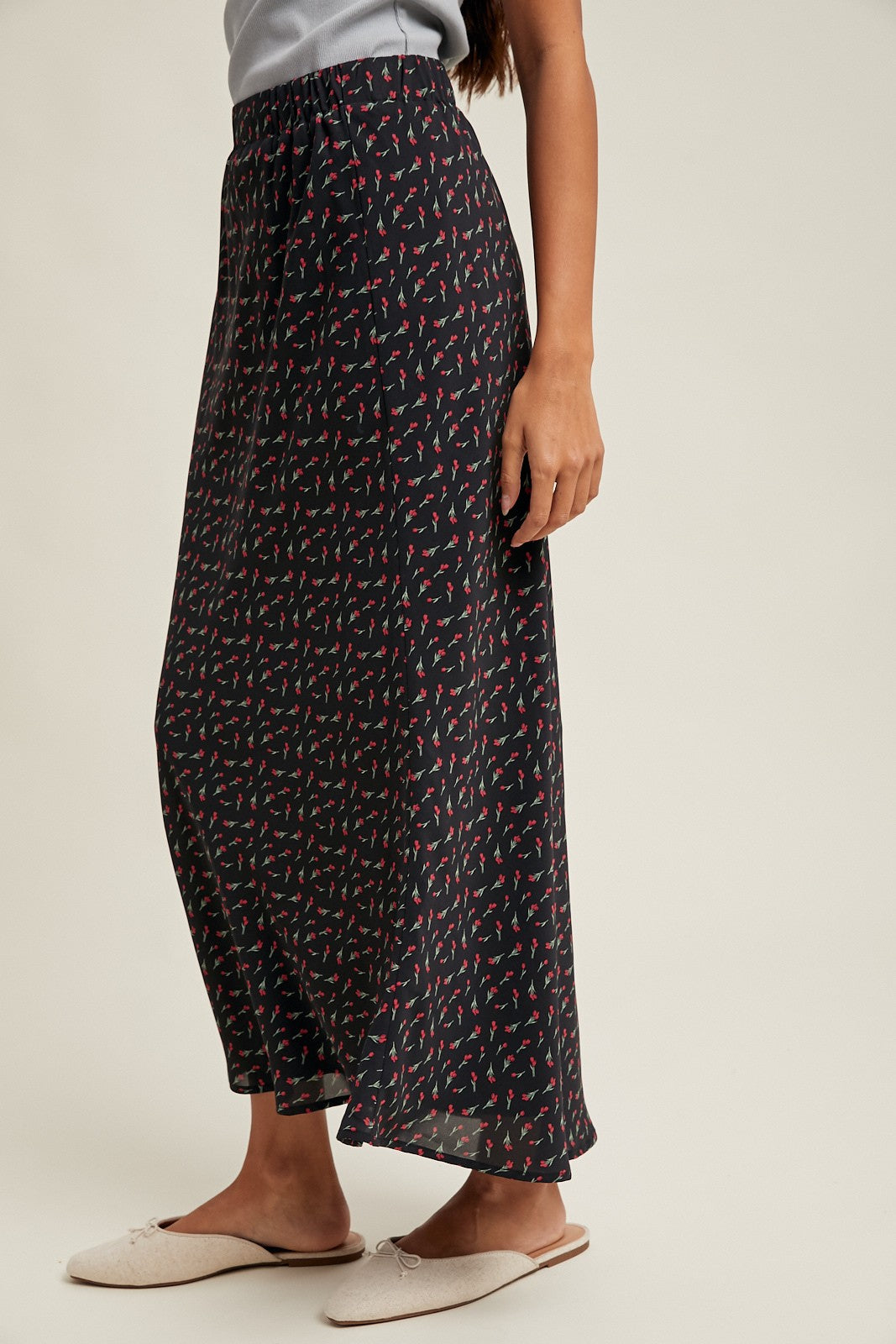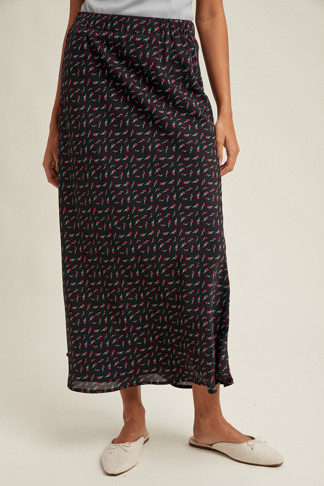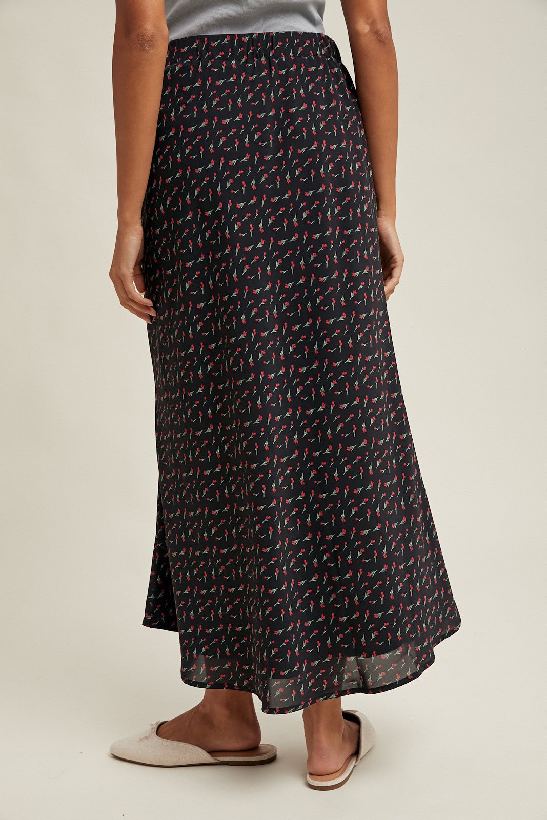 FLORAL SATIN MIDI SKIRT - ELASTIC WAISTBAND - LINED SMALL: TOTAL LENGTH - 36 3/4" MODEL IS WEARING SIZE SMALL. SELF: 100% POLYESTER LINING: 100% POLYESTER