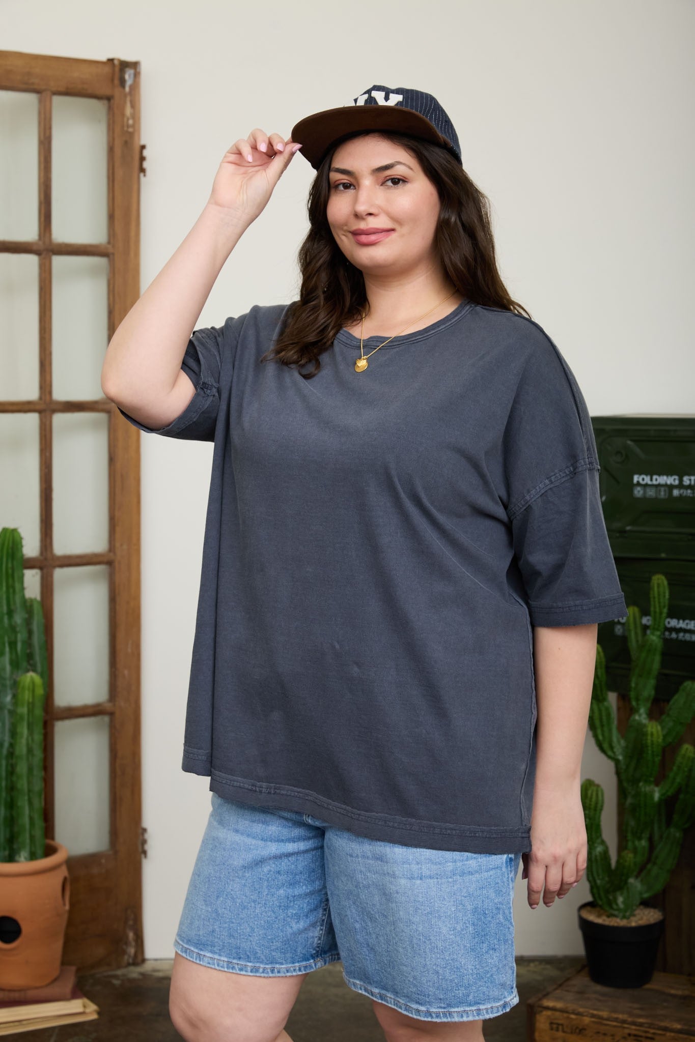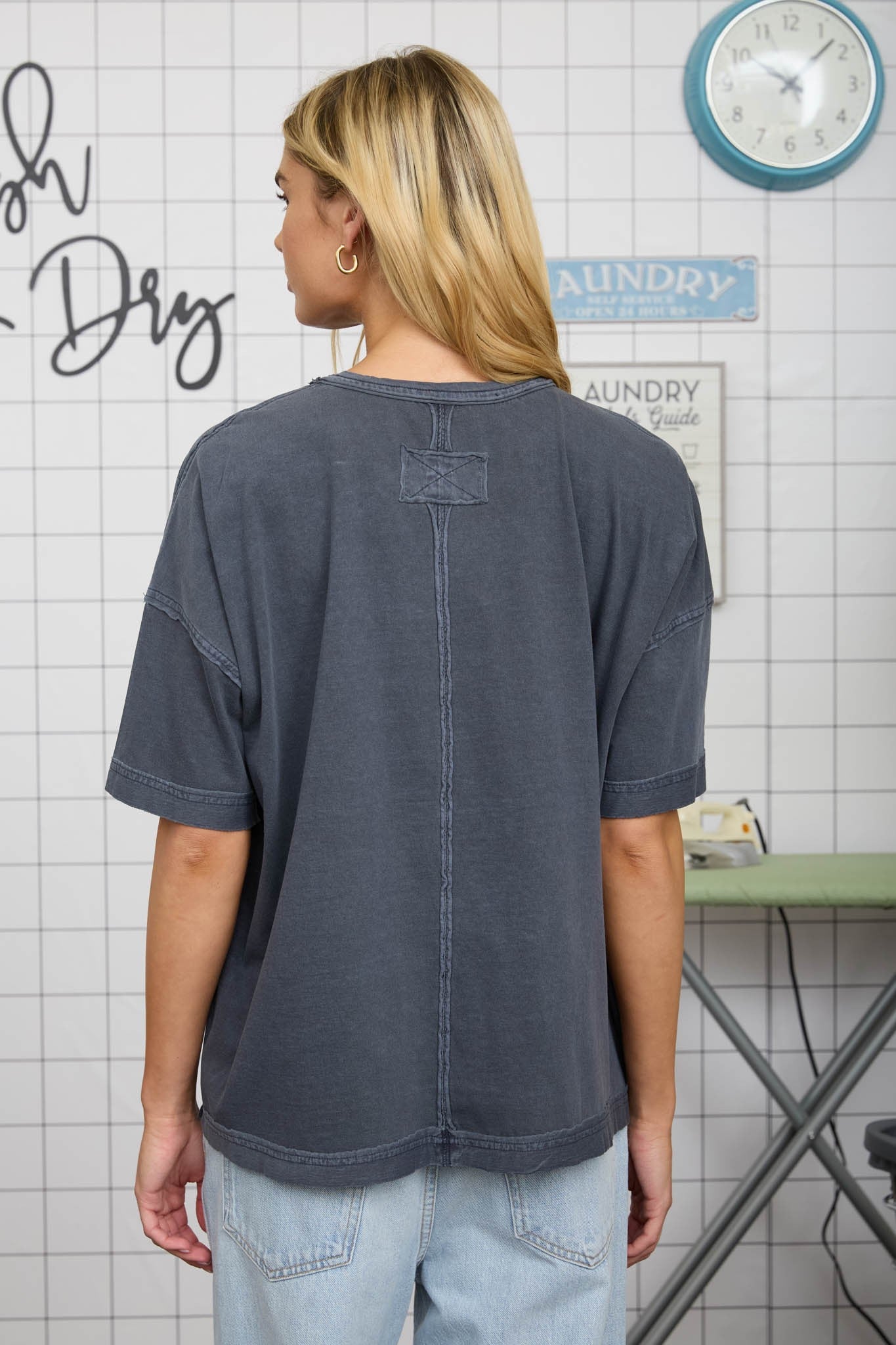 ROUND NECKLINE SHORT SLEEVES DROP SHOULDER EXPOSED SEAM RELAXED FIT ACID WASHED PATTERN TONES MAY VARY NOT LINED KNIT TOP 100%COTTON