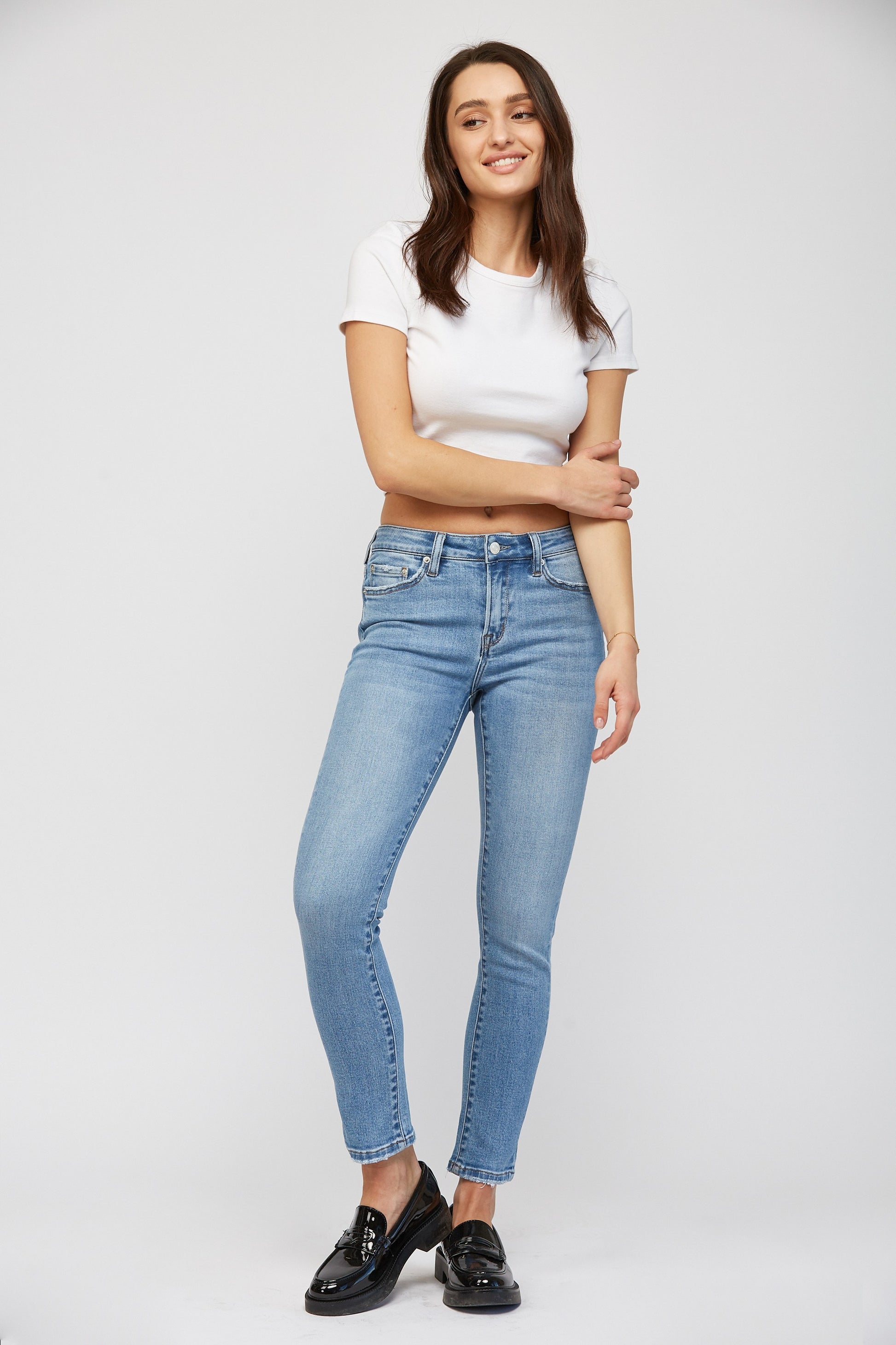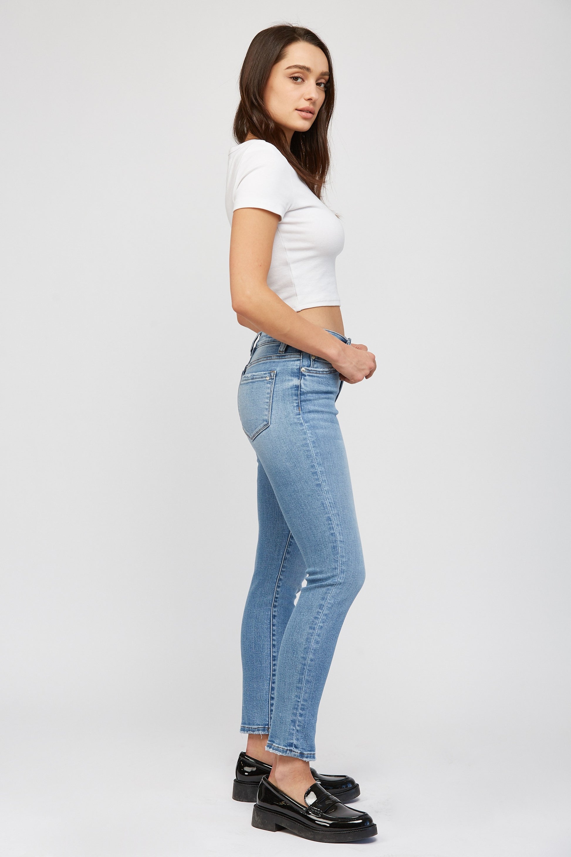 MID-RISE CIGARETTE ANKLE 66.5% COTTON, 22% POLY, 9.5% VISCOSE, 2% SPAN FRONT RISE : 9" INSEAM : 27 1/2" LEG OPENING : 11 1/2"